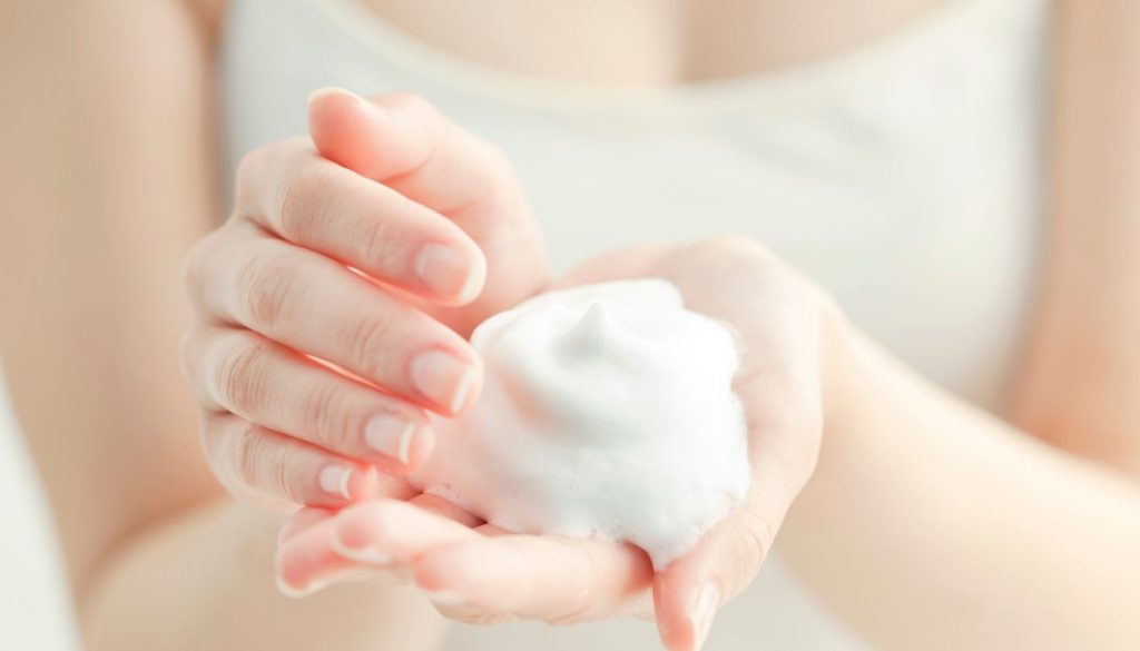顔の皮膚は非常に薄いため、洗顔時は洗顔料をしっかり泡立て、手で肌を擦らないように優しく洗ってください。熱いお湯は乾燥を助長するため、30度程度のぬるま湯を使うのがベストです。