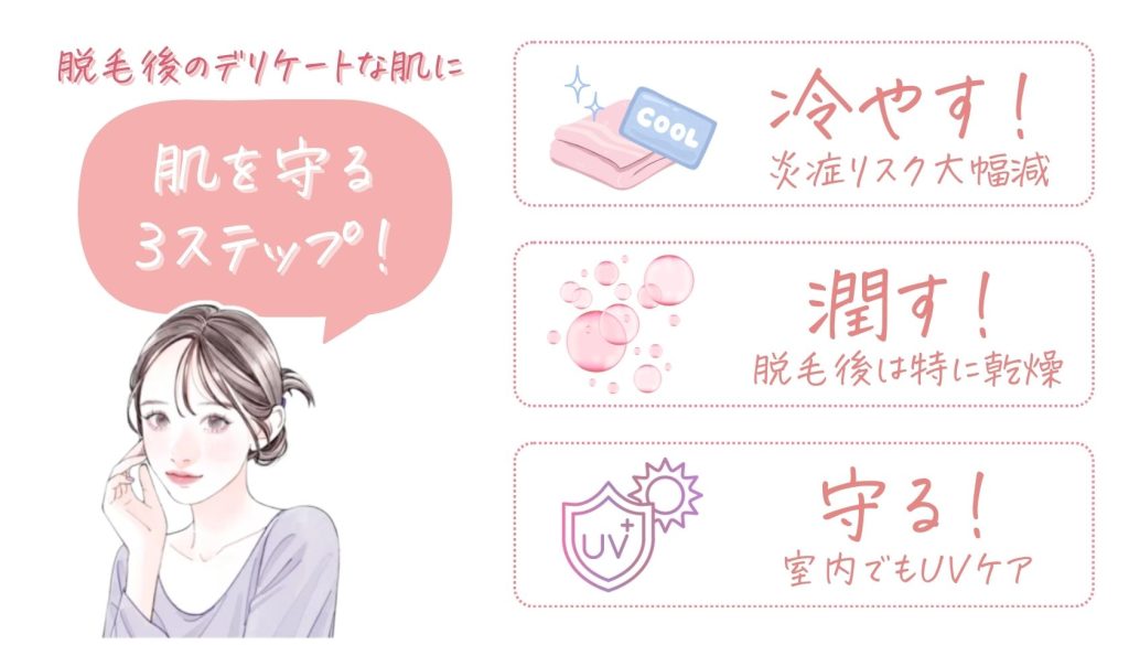 脱毛直後の肌は、熱エネルギーによって軽度の火傷を負ったような状態です。このダメージを最小限に抑え、健やかな肌を保つために欠かせない「冷やす・潤す・守る」の3つの具体的な実践ポイントを紹介します。