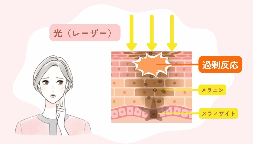 ほくろやシミ、色素沈着は「メラニンの塊」です。ここに光(レーザー)を当てると、光が集中して過剰反応し、瞬時に高熱が発生して焦げたり、やけどしたりする危険があります。