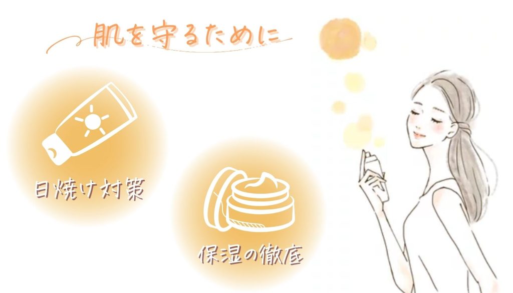 最も重要な対策は「日焼けをしないこと」と「保湿を徹底すること」です。日焼け対策は夏場以外も必須です。